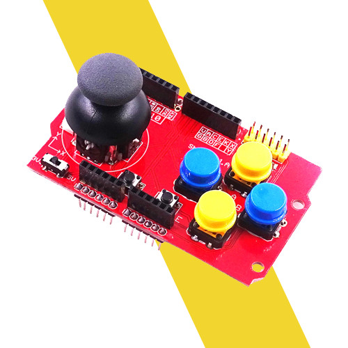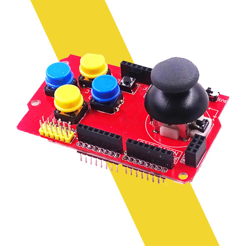 Arduino JoyStick Shield được thiết kế để kết hợp với Arduino như 1 tay cầm điều khiển chuyên nghiệp, Shield hỗ trợ 1 Joystick và 6 phím nhấn điều khiển linh hoạt, ngoài ra còn có các socket để thể gắn thêm các mạch như: NRF24L01+, LCD Nokia5110, Bluetooth HC-06, ngõ ra giao tiếp I2C,….