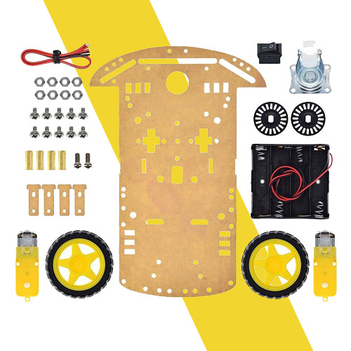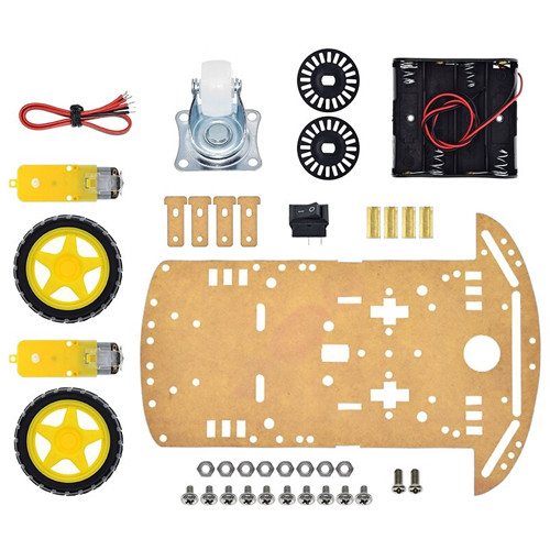 Có 2 bánh cố định được gắn chặt với động cơ làm nhiệm vụ truyền lực cho xe chạy: được làm bằng nhựa, lốp xe làm bằng cao su mềm, có độ bám đường tốt, chắc chắn. Kích thước đường kính bánh xe 65mm.1 bánh xe dẫn động giúp xe chạy đa hướng. Vật liệu từ nhựa và thép, có vòng bi xoay.