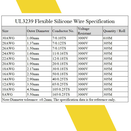 Bảng kỹ thuật dây điện chịu nhiệt silicone UL3239 AWG