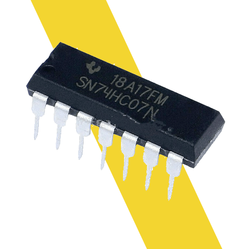 IC 74HC07 là mạch tích hợp logic CMOS tốc độ cao, gồm 6 buffer độc lập với ngõ ra kiểu open-drain, tức là không tích hợp điện trở kéo lên bên trong. Điều này giúp IC thích hợp để điều khiển tải bên ngoài như LED, rơ-le, hoặc giao tiếp nhiều thiết bị trên cùng bus. Người dùng có thể dễ dàng bổ sung trở kéo lên bên ngoài để linh hoạt thiết kế mạch. IC có dạng vỏ DIP14, dễ lắp đặt và tương thích với breadboard.