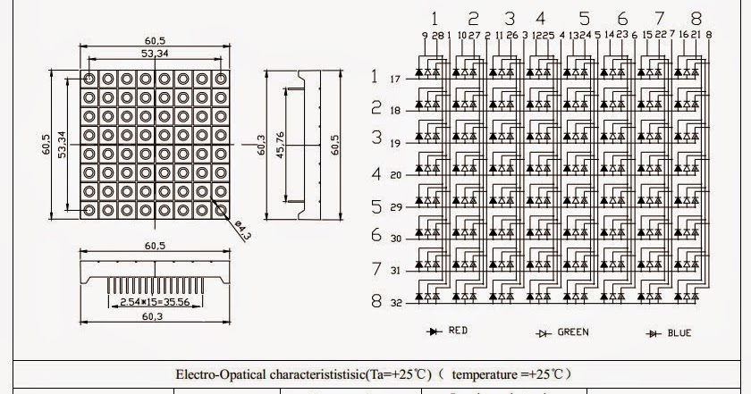 LED Matrix RGB 8*8 8x8 Led ma trận là ma trận điểm (mỗi điểm là một đèn LED) được xếp thành các hàng, cá cột nối tiếp nhau trên một màn hình lớn, độ phân giải thấp, được sử dụng để làm màn hình công nghiệp hoặc thương mại. Bên trong nó là ma trận diode hai chiều có cực dương sắp theo hàng và cực âm sắp theo cột. Có thể điều khiển từng điểm của led ma trận bằng cách điều khiển dòng điện đi qua mỗi cặp diode theo cột hoặc hàng. Loại ma trận này rất phổ biến trong sử dụng hiển thị thông tin, nó cho phép hiển thị hình ảnh và văn bản dạng tĩnh hoặc động. Bên dưới là hình 1 led ma trận.