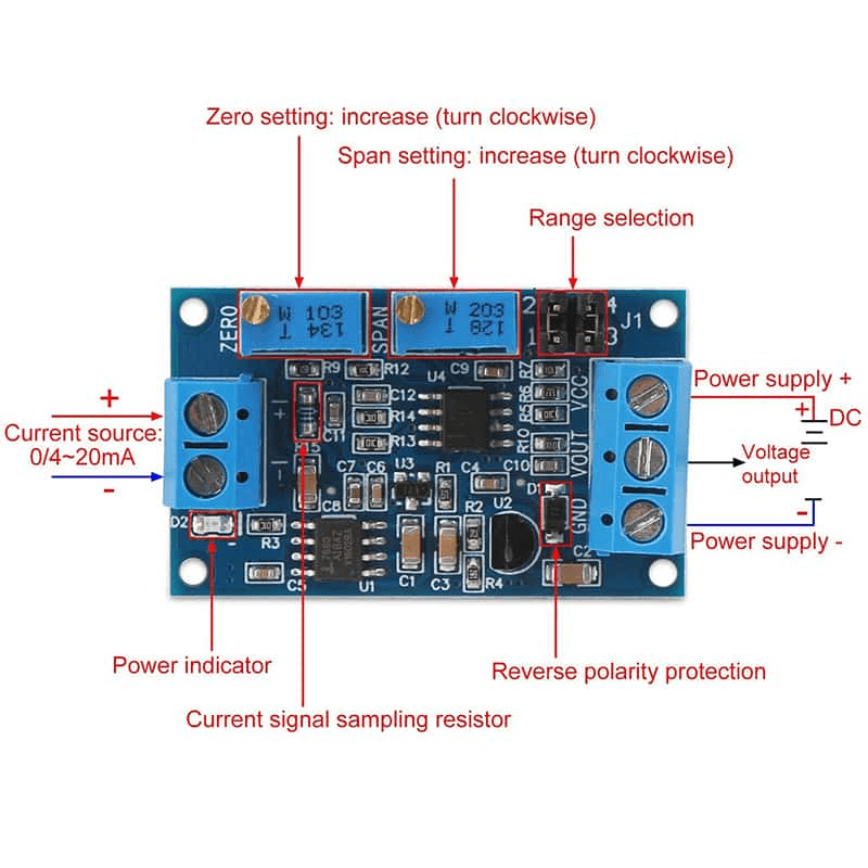 Khi dòng đầu vào đạt giá trị tối đa (20mA), hiệu chỉnh áp đầu ra bằng biến trở để đạt giá trị tối đa mong muốn (ở các mức áp đầu ra 3.3VDC, 5VDC hoặc 10VDC hiệu chỉnh qua Jumper J1, điện áp mong muốn tối thiểu có thể đạt được là 2.5VDC).