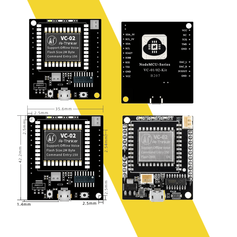 Mạch nhận dạng giọng nói VC-02 Kit Ai-thinker là phiên bản ra chân của VC-02 Module tích hợp mạch nạp và giao tiếp UART CH340 kèm theo micro thu âm và loa phát giọng nói,