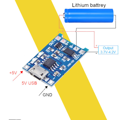 Ổ cắm MICRO USB và pad + bên cạnh ổ cắm USB MICRO là đầu vào nguồn cho 5V. B + sau đó điện cực dương của pin lithium, B – sau đó điện cực âm của pin lithium. OUT + và OUT- kết nối với tải, chẳng hạn như kết nối tích cực và âm phủ điện thoại di động tăng hoặc tải khác.