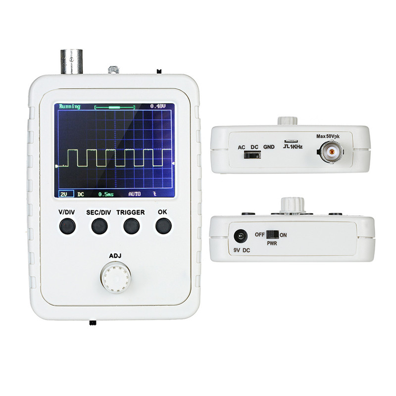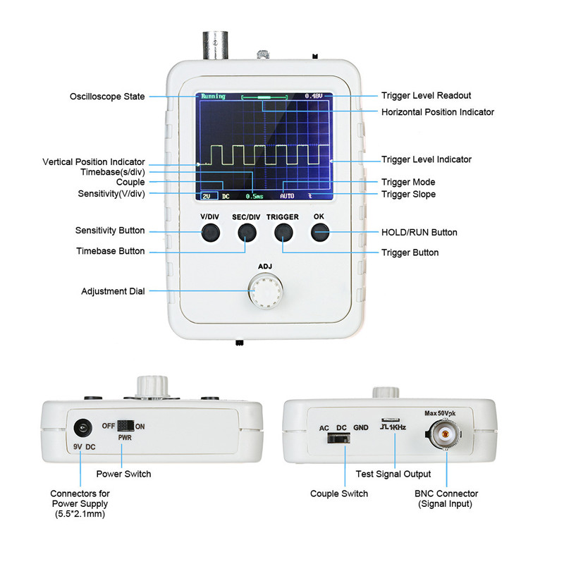 - Máy hiện sóng Oscilloscope - DSO150 sử dụng bộ xử lý ARM Cortex-M3 và với màn hình TFT 2.4-inch. Máy có thể hiển thị dạng sóng thông số, chẳng hạn như tần số, thời gian, độ rộng xung, duty ratio, các giá trị Min/Max, đỉnh - đỉnh.