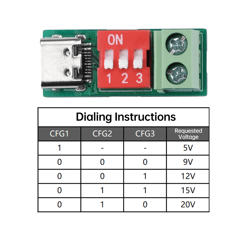 Sản phẩm được trang bị nút chỉnh (trigger dial) cho phép lựa chọn điện áp đầu ra từ 5V, 9V, 12V, 15V đến 20V, giúp dễ dàng tận dụng củ sạc nhanh làm nguồn cấp DC cho các thiết bị điện tử, DIY hoặc test mạch.