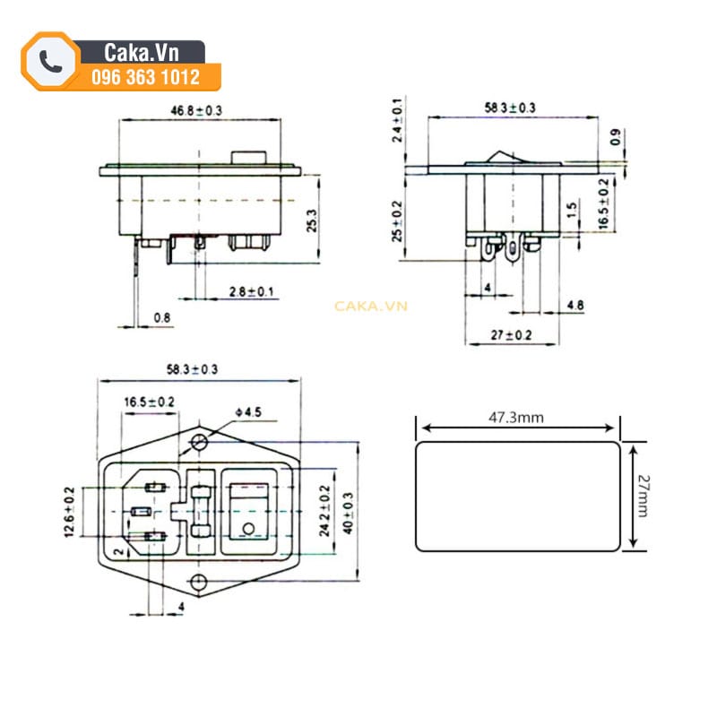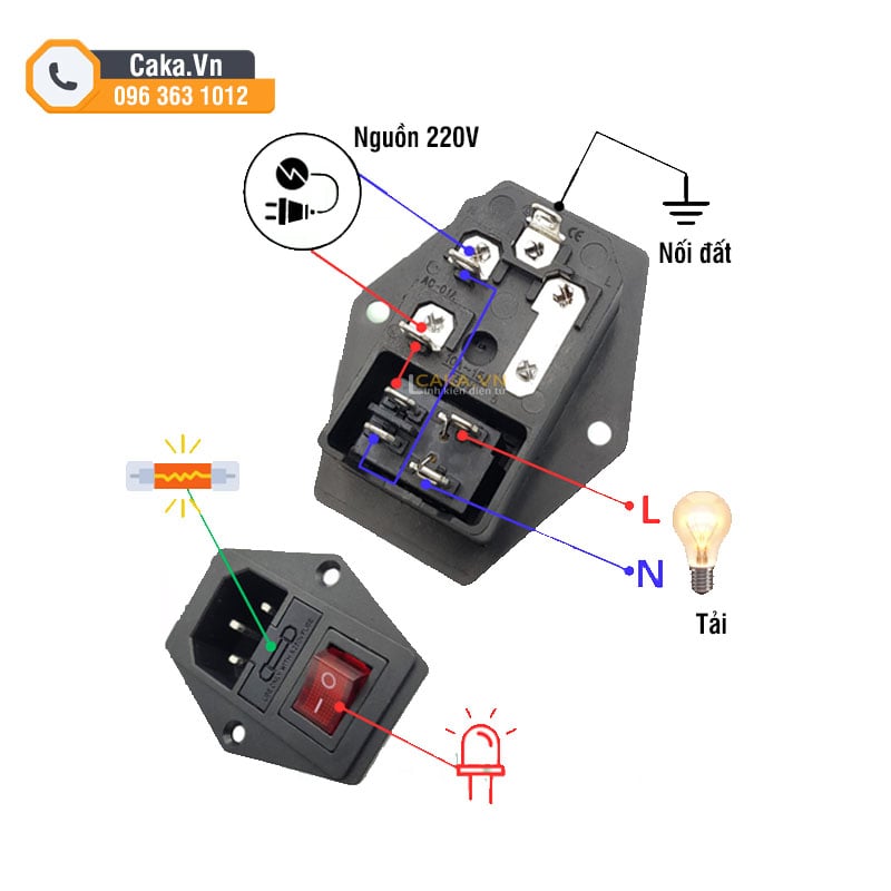Sơ đồ nối dây Ổ Cắm Nguồn AC-01A 3 Trong 1 Có Công Tắc, Cầu Chì, Đèn Báo