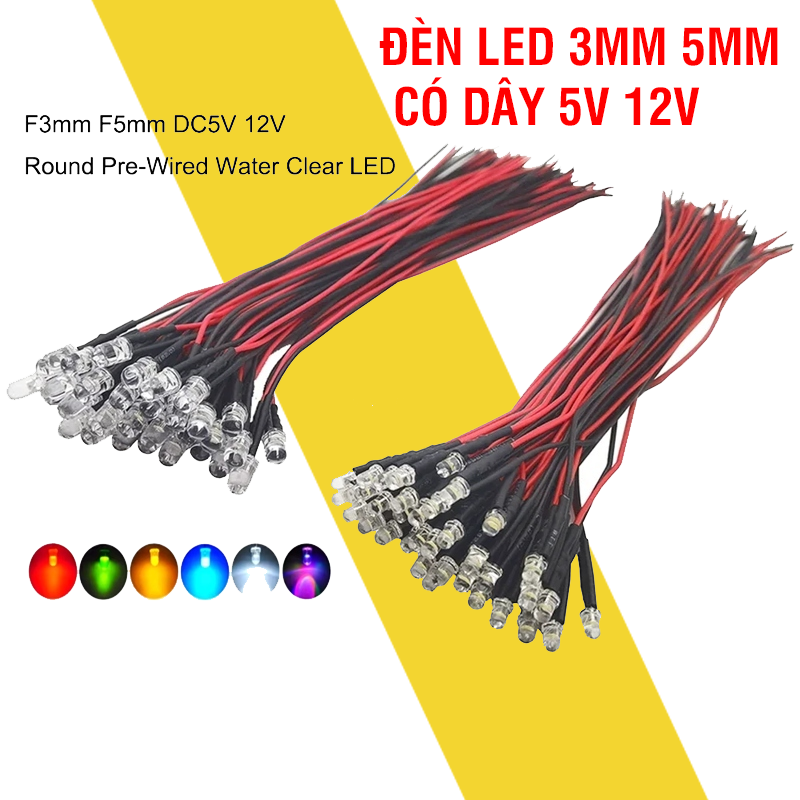 Set 5 Bóng đèn led 5v 12v có dây dài 20cm 3mm/5mm nhiều màu chất lượng cao