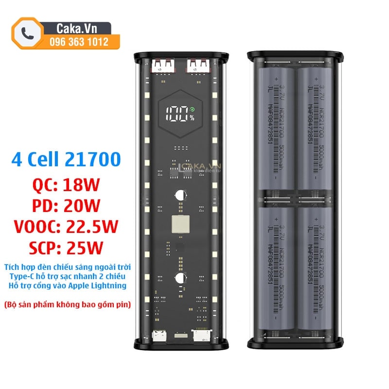 Vỏ sạc dự phòng trong suốt đựng pin 21700 (4 cell) là lựa chọn hoàn hảo để tạo bộ sạc di động gọn nhẹ, dung lượng vừa đủ. Hỗ trợ nhiều chuẩn sạc nhanh PD, QC, VOOC, SCP, sản phẩm phù hợp cho nhu cầu sử dụng hằng ngày hoặc khi đi xa.